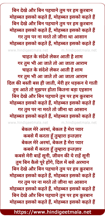 Lyrics of Bin Dekhe Aur Bin Pahachaane Tum Par Ham Qurabaan - बिन देखे और बिन पहचाने, तुम पर हम कुर्बान