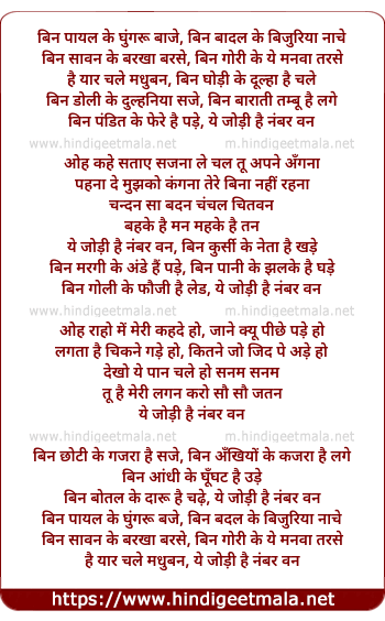 Lyrics of Bin Payal Ke Ghunghru Baje - बिन पायल के घुंगरू बाजे