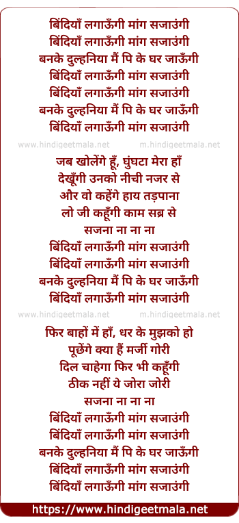 Lyrics of Bindiyaa Lagaungi - बिंदियाँ लगाऊँगी