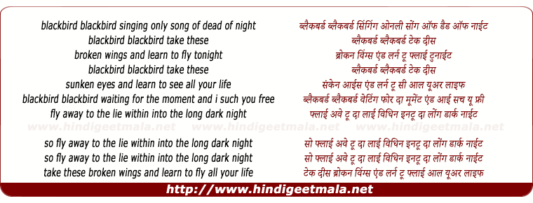Lyrics of Blackbird - ब्लैकबर्डblackbird blackbird singing only song of dead of night