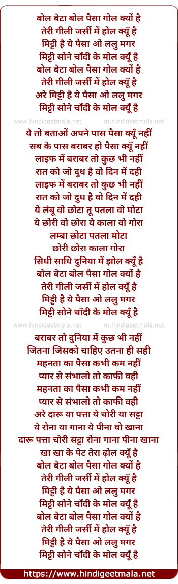 Lyrics of Bol Beta Bol Paisa Gol Kyon Hai - बोल बेटा बोल पैसा गोल क्यों है