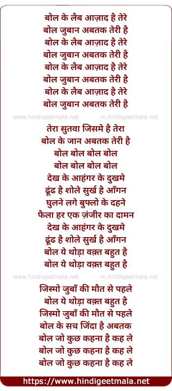 Lyrics of Bol Ke Lab Azaad Hai - बोल के लब आजाद हैं