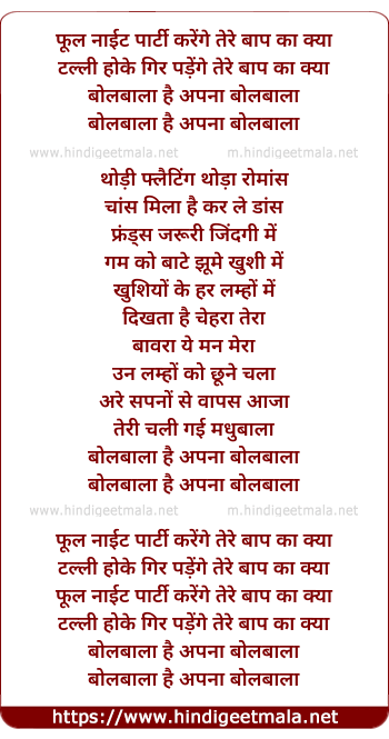 Lyrics of Bolbala (Part - Ii) - फूल नाईट पार्टी करेंगे तेरे बाप का क्या