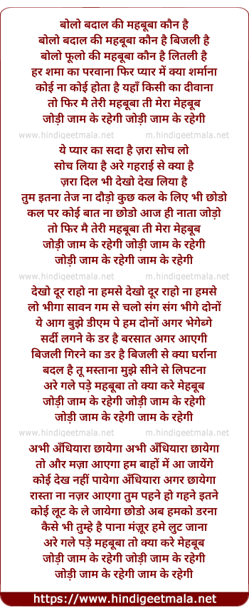 Lyrics of Bolo Baadal Ki Mahbuba Kaun Hain, Bijli Hai - बोलो बदाल की महबूबा कौन है, बिजली है