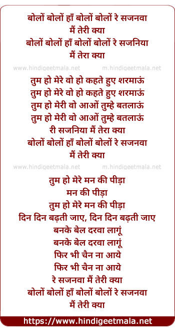 Lyrics of Bolo Bolo Re Sajanva Mai Teri Kya - बोलों बोलों रे सजनवा मैं तेरी क्या
