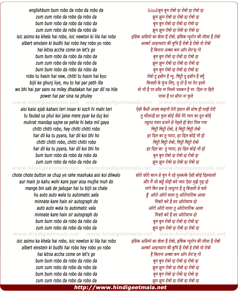 Lyrics of Boom Boom Robo Da - बूम बूम रोबो दा