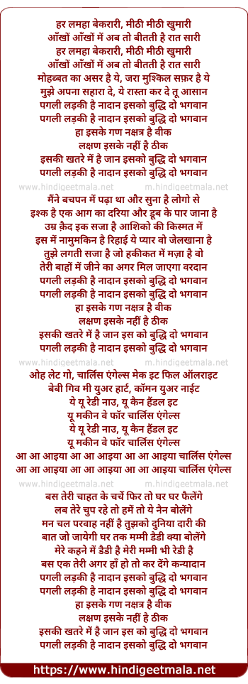 Lyrics of Buddhi Do Bhagwaan (Charlie Angels) - हर लमहा बेकरारी, मीठी मीठी खुमारी