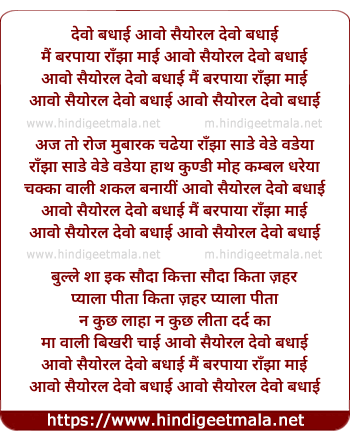 Lyrics of Bulleh Shah - देवो बधाई आवो सैयोरल देवो बधाई