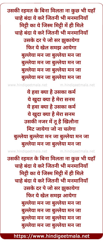 Lyrics of Bulleya Man Jaa - उसकी रहमत के बिना मिलता ना कुछ भी यहाँ
