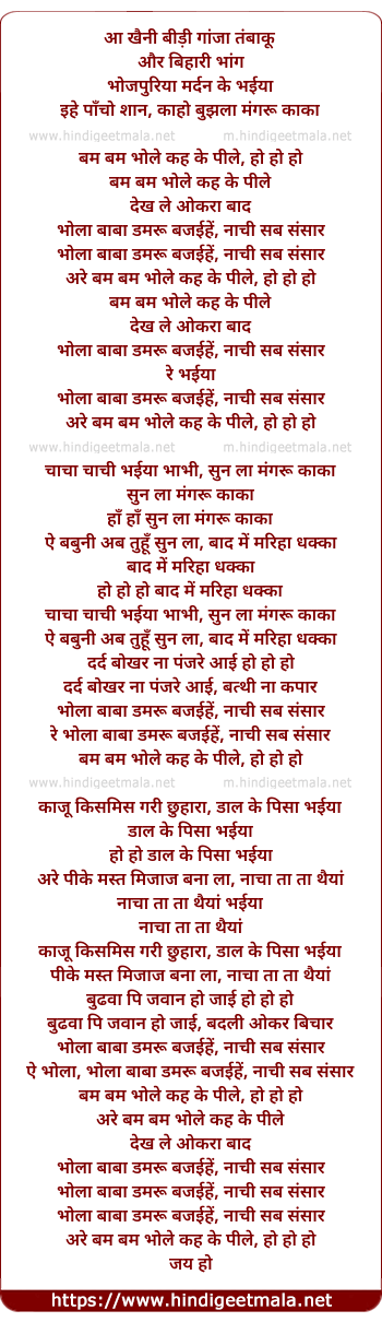 Lyrics of Bum Bum Bhole - आ खैनी बीड़ी गांजा तंबाकू
