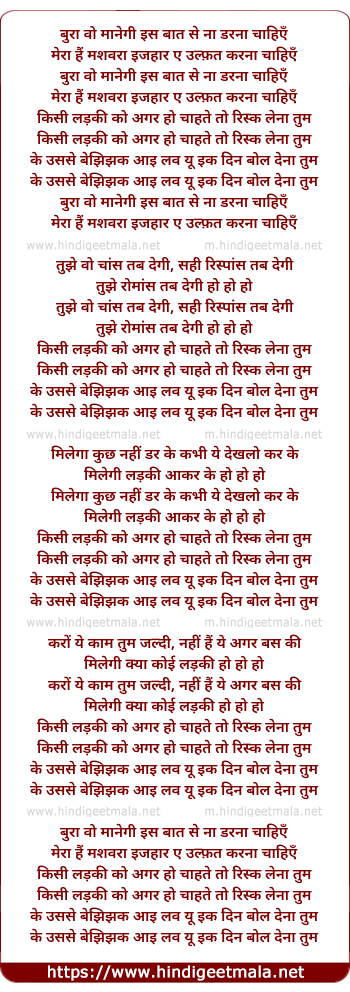 Lyrics of Bura Wo Maanegi - बुरा वो मानेगी इस बात से ना डरना चाहिएँ