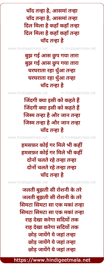 Lyrics of Chaand Tanahaa Hai, Aasmaan Tanahaa - चाँद तन्हा है, आसमां तन्हा