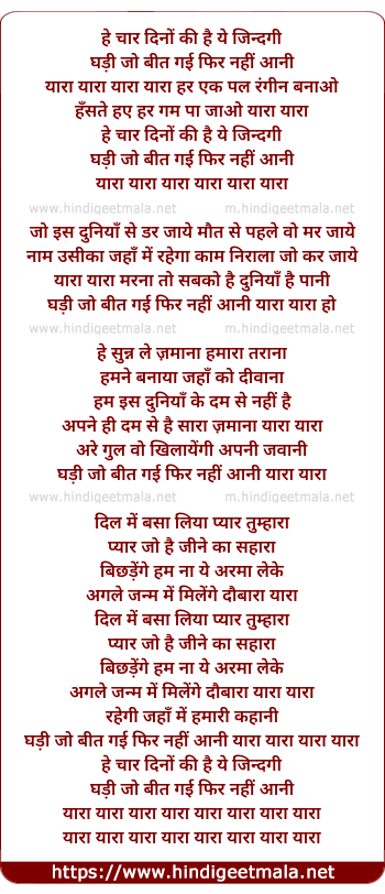 Lyrics of Chaar Dino Ki Hai Ye Zindgani - चार दिनों की है ये जिन्दगी