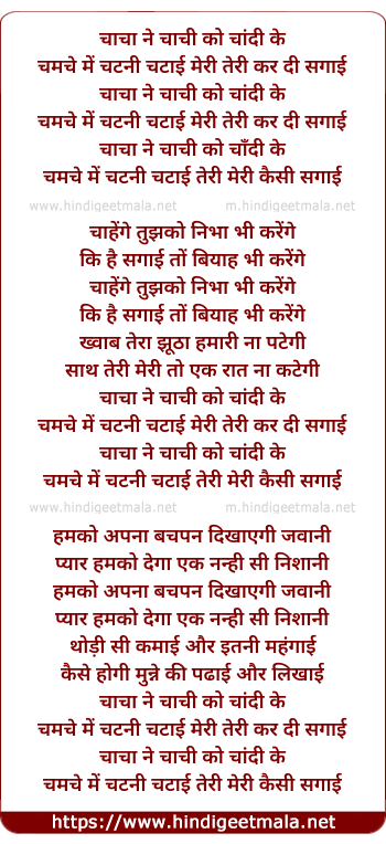 Lyrics of Chacha Ne Chachi Ko Chandi Ke - चाचा ने चाची को चांदी के