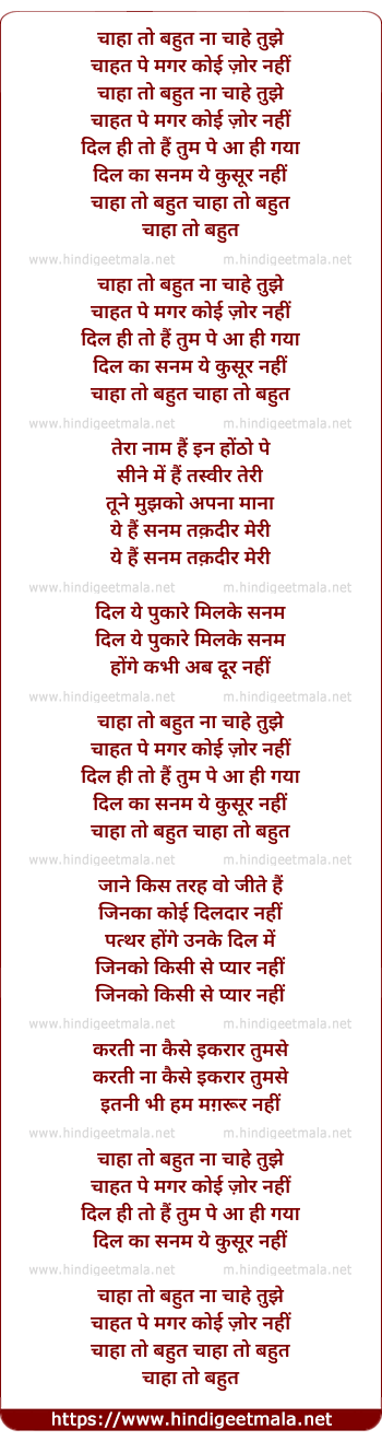 Lyrics of Chaha To Bahut Na Chahe Tujhe - चाहा तो बहुत ना चाहे तुझे