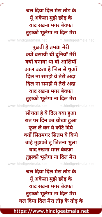 Lyrics of Chal Diya Dil Meraa Tod Ke - चल दिया दिल मेरा तोड़ के