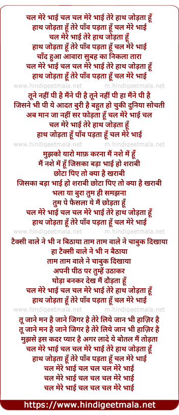 Lyrics of Chal Mere Bhai Tere Hath Jodta Hu - चल मेरे भाई चल चल मेरे भाई तेरे हाथ जोड़ता हूँ