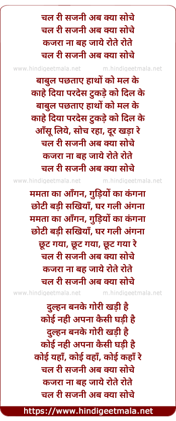 Lyrics of Chal Ri Sajani Ab Kya Soche, Kajra Na Beh Jaye Rote Rote - चल री सजनी अब क्या सोचे, कजरा ना बह जाये रोते रोते