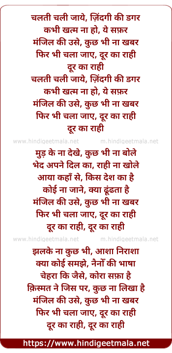 Lyrics of Chalati Chali Jaaye Zindagi Ki Dagar, Dur Kaa Raahi - चलती चली जाये, ज़िंदगी की डगर