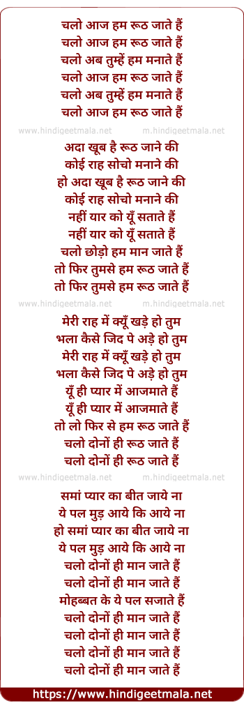 Lyrics of Chalo Aaj Hum Ruth Jaate Hain - चलो आज हम रूठ जाते हैं