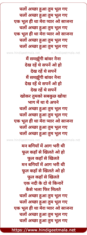 Lyrics of Chalo Achha Hua - चलों अच्छा हुआ तुम भूल गए