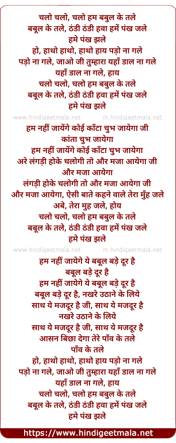 Lyrics of Chalo Hum Babul Ke Tale, Thandi Thandi Hawa Hame Pankhe Jhale - चलो हम बबुल के तले, ठंडी ठंडी हवा हमें पंख जले