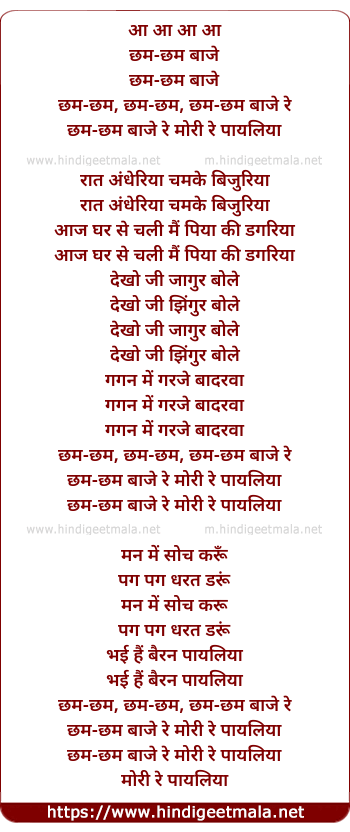 Lyrics of Cham Cham Baaje Re Mori Re Payaliya - छम-छम बाजे रे मोरी रे पायलिया