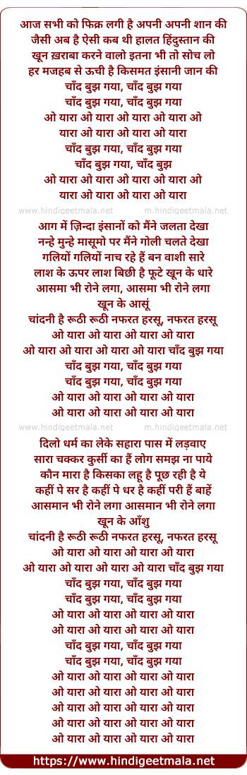 Lyrics of Chand Bujh Gaya, O Yaara O Yaara - आज सभी को फिक्र लगी है अपनी अपनी शान की