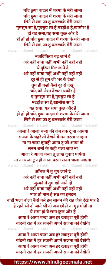 Poetic Translation - Lyrics of Chand Chupa Badal Me Sharma Ke Meree Jana - चाँद छुपा बादल में शरमा के मेरी जाना
