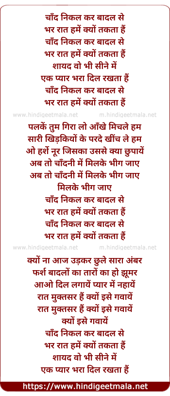 Lyrics of Chand Nikal Kar - चाँद निकल कर बादल से