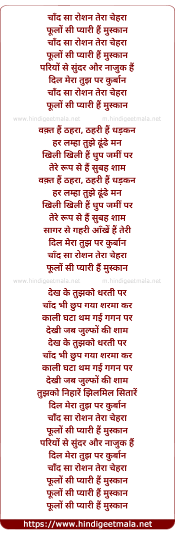 Lyrics of Chand Sa Roshan Tera Chehra - चाँद सा रोशन तेरा चेहरा