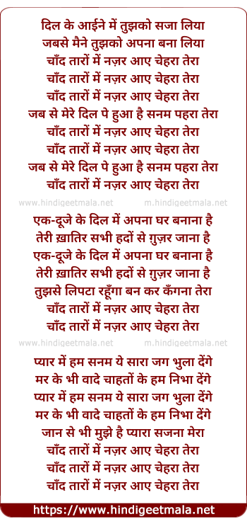 Lyrics of Chand Taaro Me Najar Aaye Chehra Tera - चाँद तारों में नज़र आये चेहरा तेरा