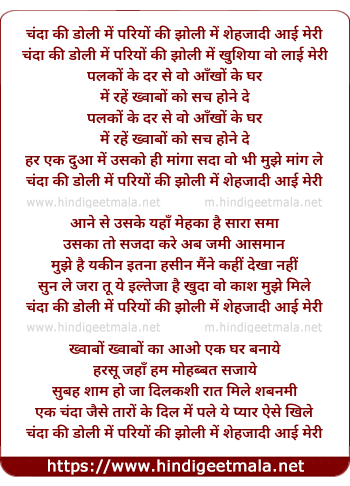 Lyrics of Chanda Ki Doli Mein, Pariyon Ki Jholi Mein - चंदा की डोली में परियों की झोली में शेहजादी आई मेरी
