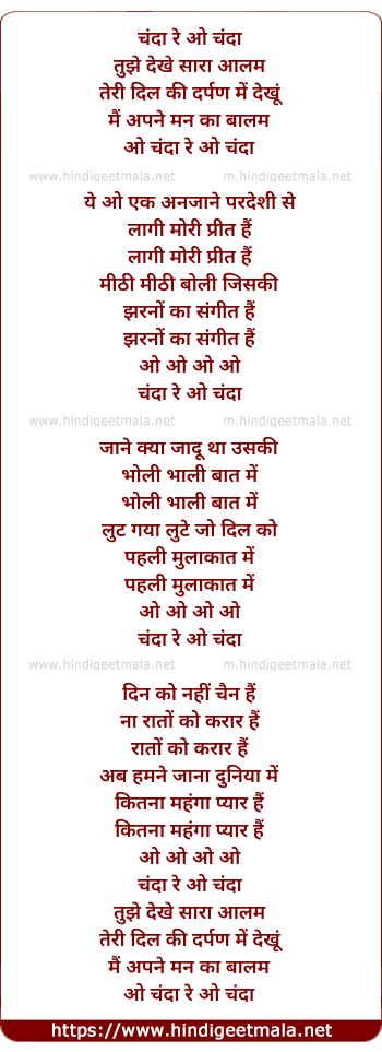 Lyrics of Chanda Re O Chanda Tujhe Dekhe - चंदा रे ओ चंदा तुझे देखे