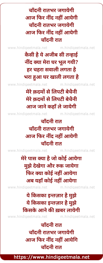 Lyrics of Chandi Raat Bhar - (चाँदनी रातभर जगायेगी