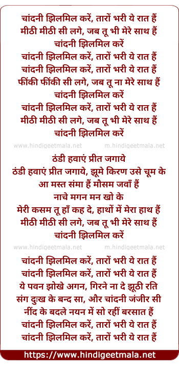Lyrics of Chandni Jhilmil Kare Taro - चांदनी झिलमिल करें तारों