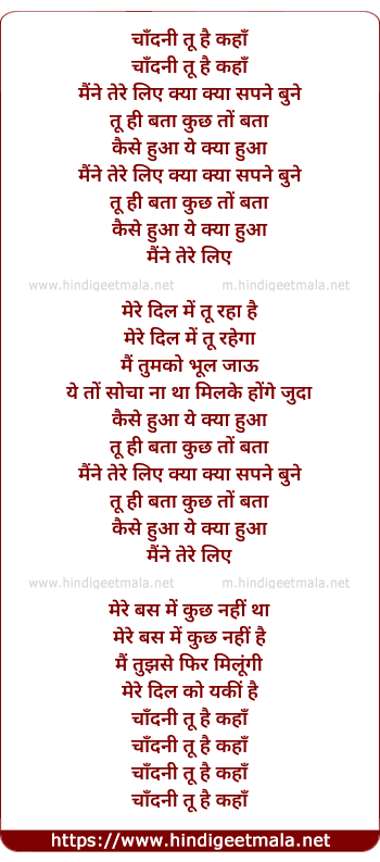 Lyrics of Chandni Tu Hai Kahan, Maine Tere Liye Kya Kya Sapne Bune - चाँदनी तू है कहाँ,मैंने तेरे लिए क्या क्या सपने बुने