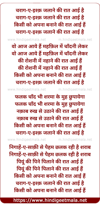 Lyrics of Charag Ishq Jalane Ki Raat Aayi Hai - चराग-ए-इश्क़ जलाने की रात आई है