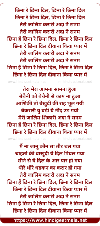 Lyrics of Cheena Re Cheena (Remix) - छिना रे छिना दिल, छिना रे छिना दिल
