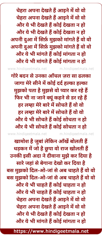 Lyrics of Chehra Apna Dekhte Hai Aaine Me Woh Woh - चेहरा अपना देखते हैं आइने में वो वो