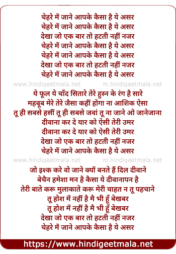 Lyrics of Chehre Me Jane Apke, Kaisa Hai Ye Asar - चेहरे में जाने आपके, कैसा है ये असर