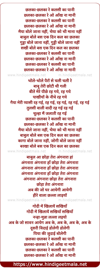Lyrics of Chhalka Chhalka Re Kalsi Ka Pani - छलका-छलका रे कलसी का पानी