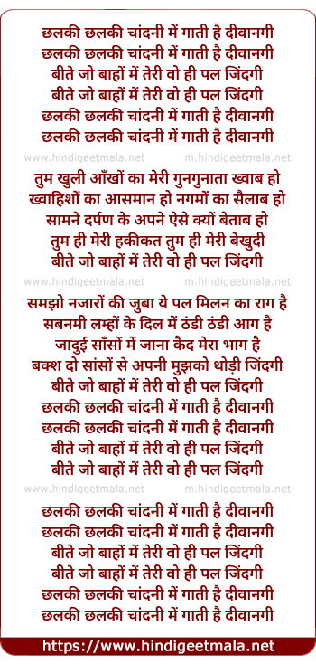 Lyrics of Chhalki Chhalki Chaandani Mein - छलकी छलकी चांदनी में गाती है दीवानगी