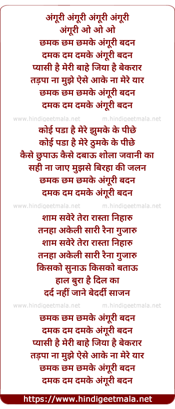 Lyrics of Chhamak Chham Chhamake Anguri Badan - छमक छम छमके अंगूरी बदन