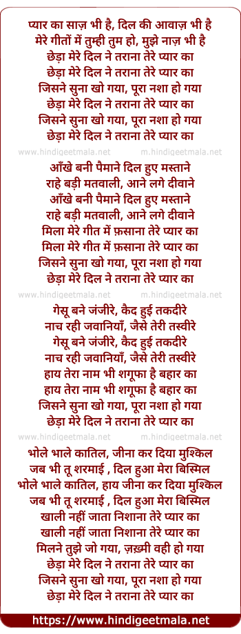 Lyrics of Chheda Mere Dil Ne Tarana Tere Pyar Ka - छेड़ा मेरे दिल ने तराना तेरे प्यार का