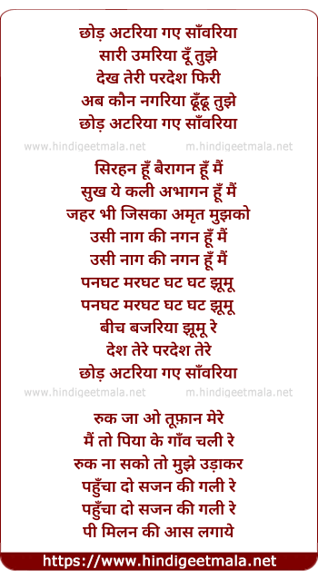 Lyrics of Chhod Atariya Gaye Sanwariya - छोड़ अटरिया गए साँवरिया