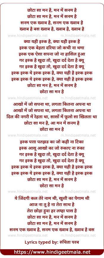 Lyrics of Chhota Sa Mann Hai, Mann Me Sanam Hai - छोटा सा मन है, मन में सनम है