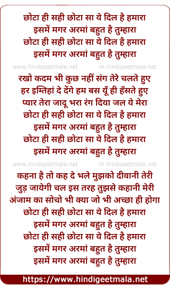 Lyrics of Chhota Sa Ye Dil Hai - छोटा ही सही छोटा सा ये दिल है हमारा