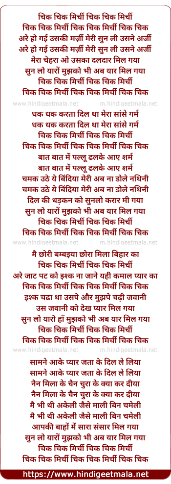 Lyrics of Chik Chik Mirchi Are Ho Gayi Uski Marzi - चिक चिक मिर्ची अरे हो गई उसकी मर्जी