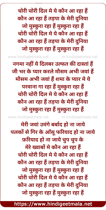 Lyrics of Chori Chori Dil Me Ye Kon Aa Raha Hai - चोरी चोरी दिल मे ये कौन आ रहा हैं